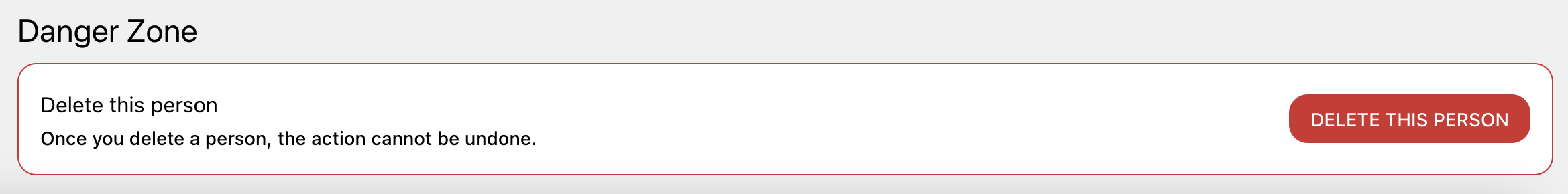 Scroll to the Danger Zone at the bottom of the page and click DELETE THIS PERSON. A dialog will appear requiring you to type delete to confirm deletion.