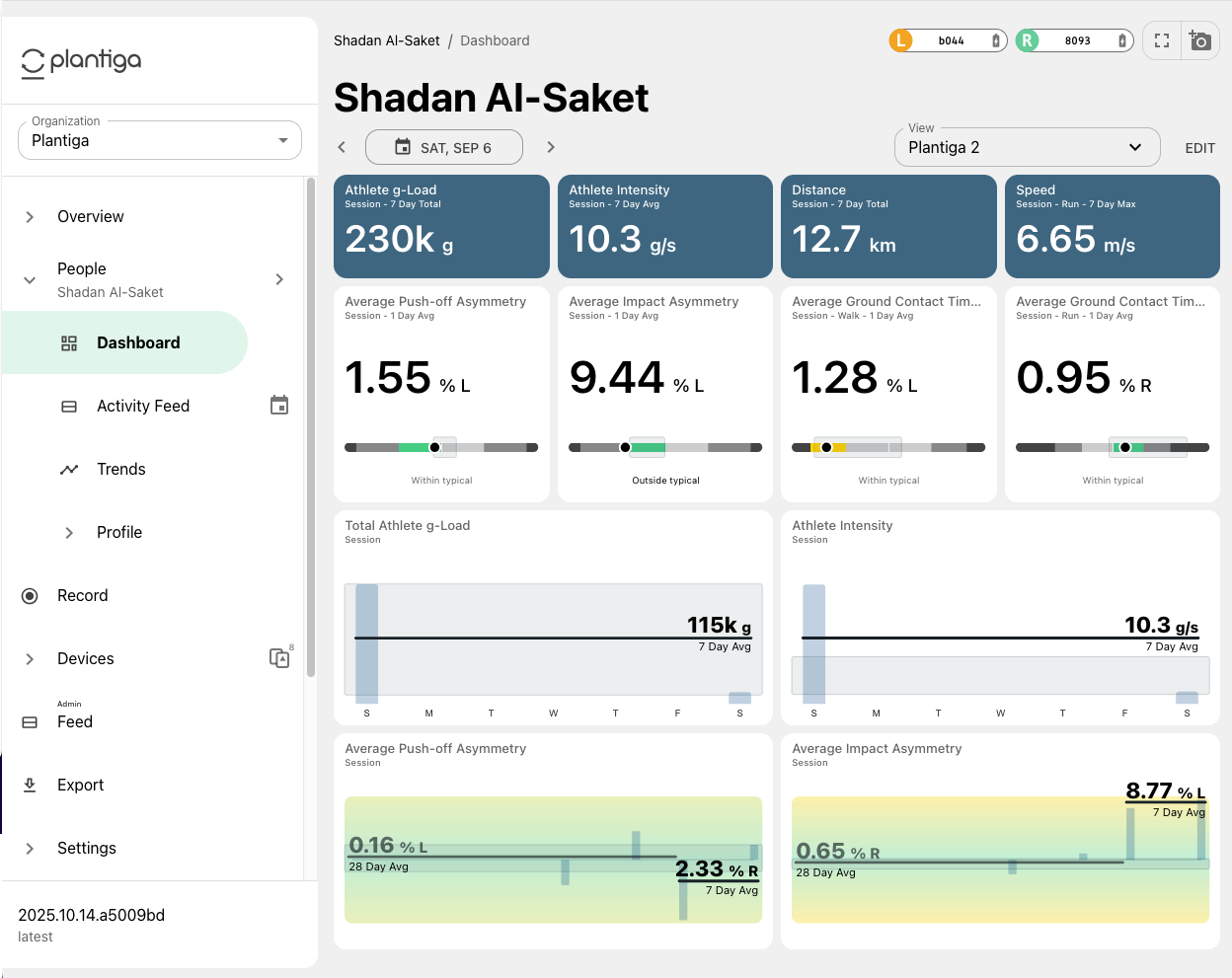 A different selection of key performance and asymmetry metrics are available for each activity in different widget formats.
