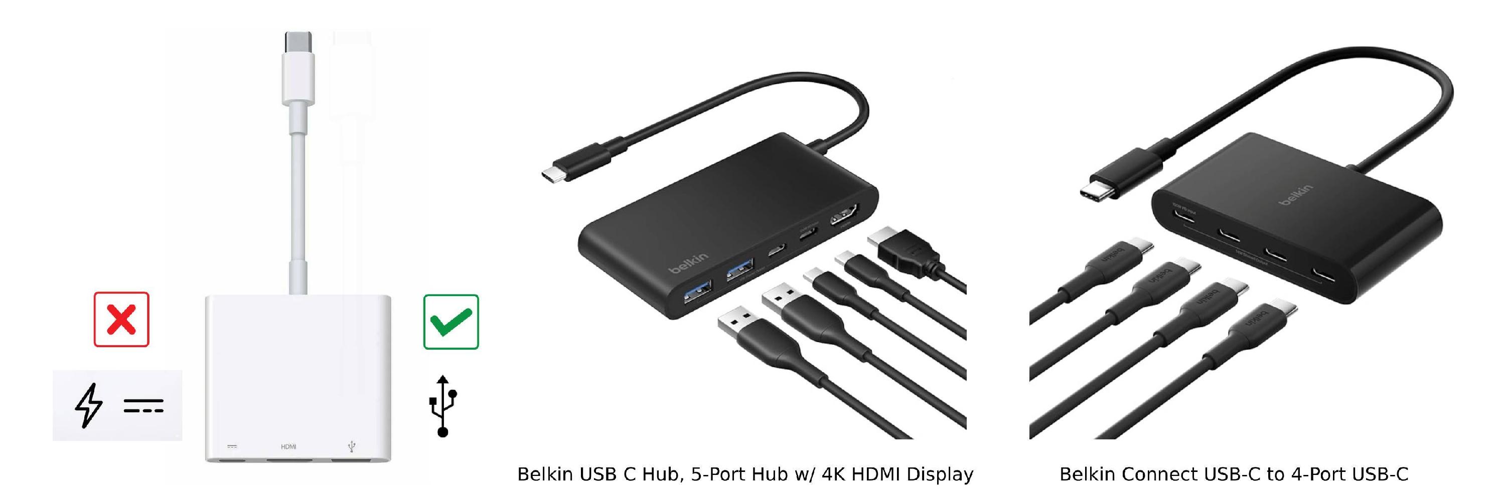 The travel dock must be connected to your Mac with a USB cable that supports data transfer, not just charging. Some USB extensions and adapters only pass power and won’t carry data. Check for the USB data symbol on the cable or adapter. The lightning bolt or DC power symbols only mean power, not data.